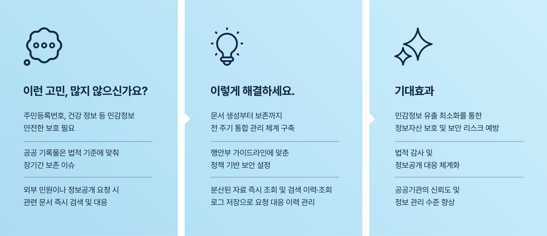 | • | 주민등록번호, 건강정보 등 민감 데이터 보호 필요 | • | 문서 생성부터 보존까지 전 주기 통합 관리 체계 구축 | • | 민감 데이터 유출 최소화 |