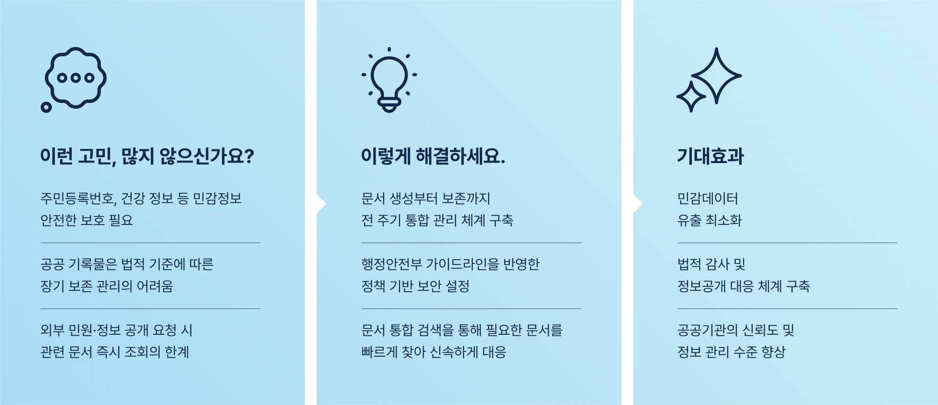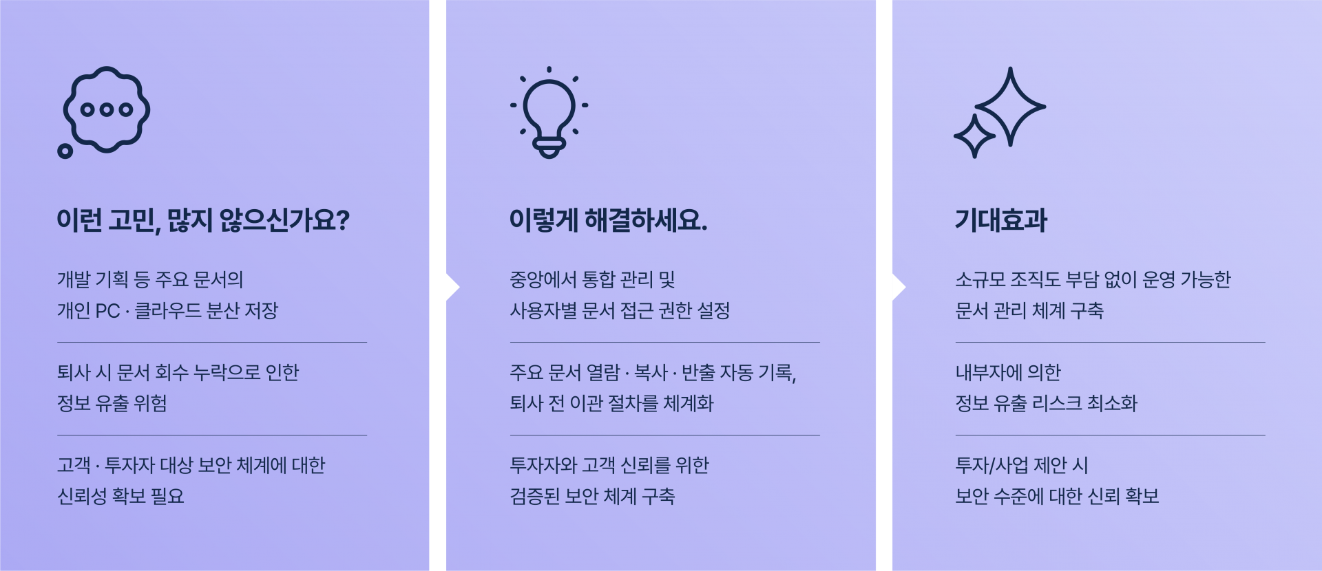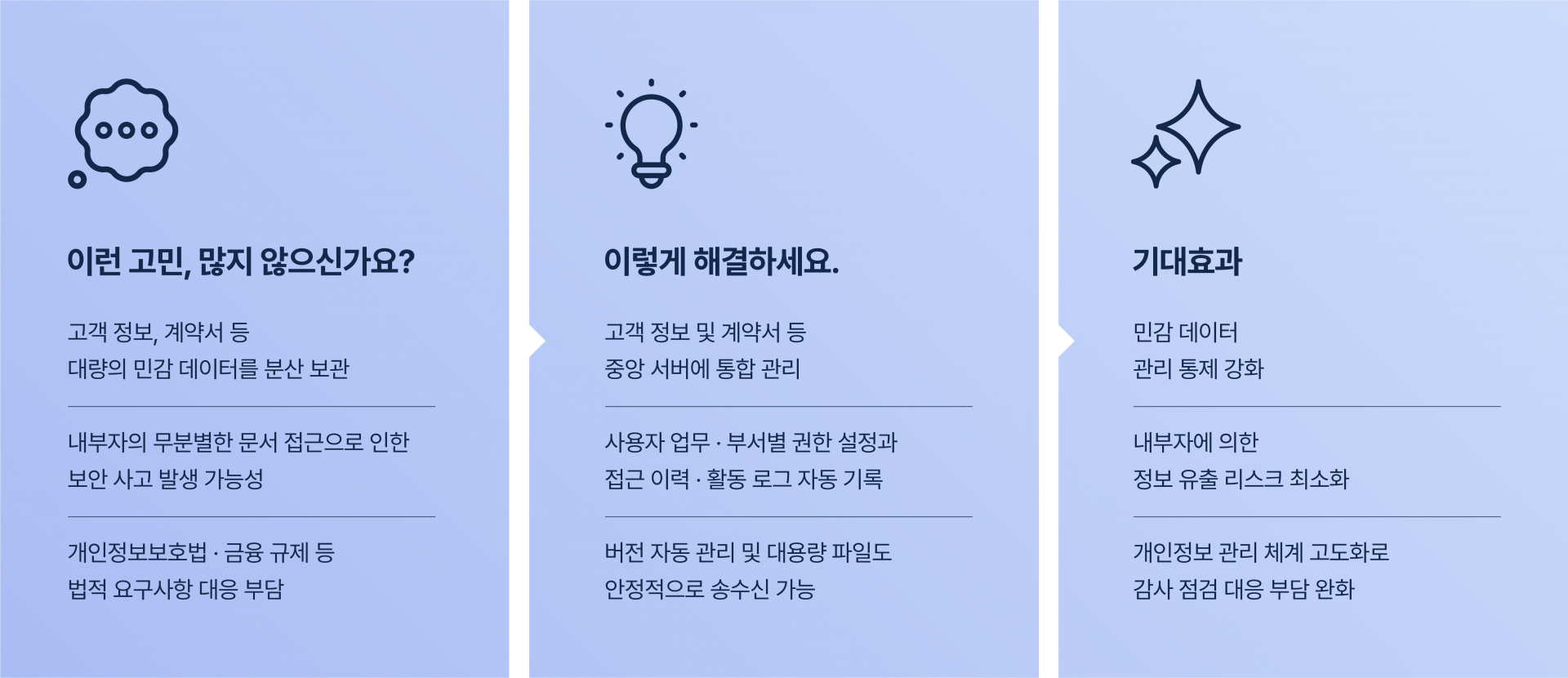 비정형 데이터 증가, 재택근무 확산, 보안 위협 고도화로 기존 파일서버·NAS·클라우드 기반 문서 관리는 통제와 보호에 한계가 있습니다.