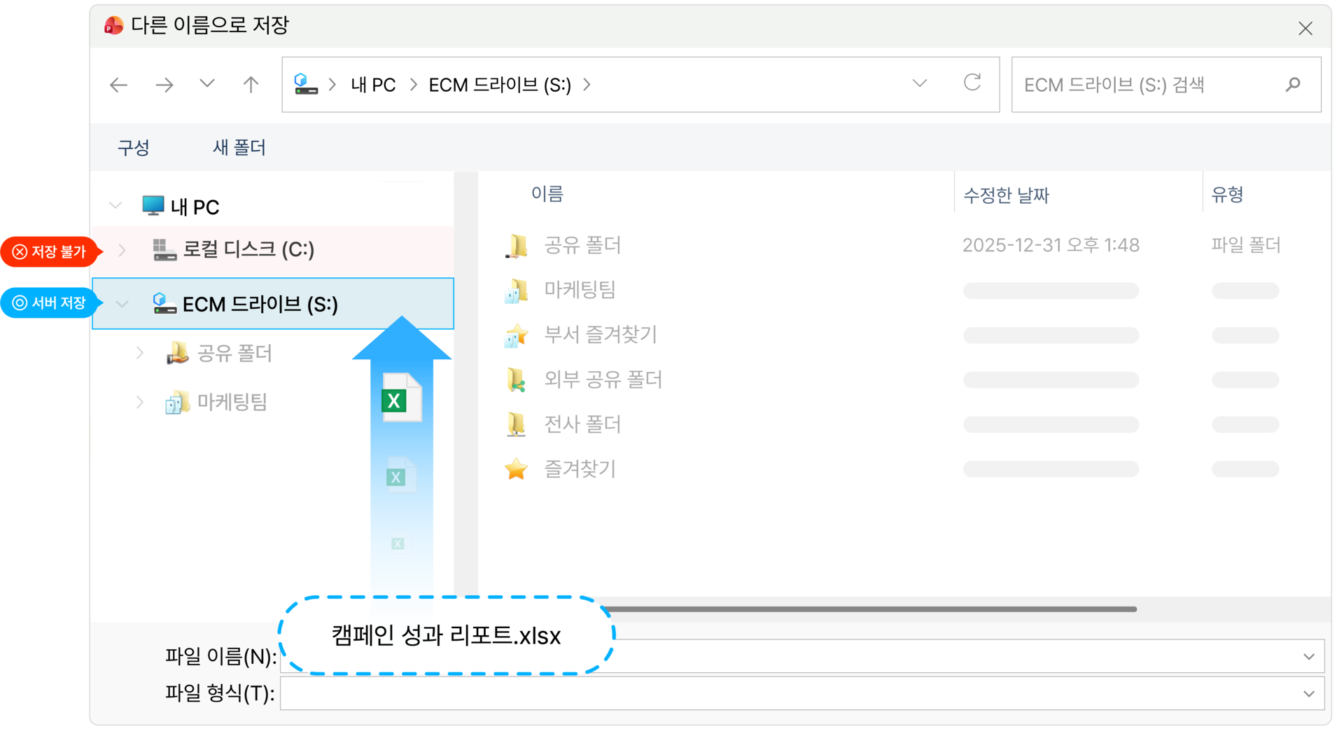 로컬 PC 저장 제어 l 로컬 PC 저장을 원천 차단하고, 모든 문서를 중앙 서버로 안전하게 수집·관리