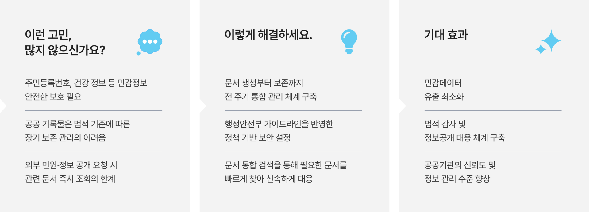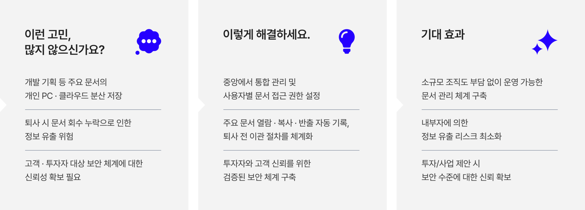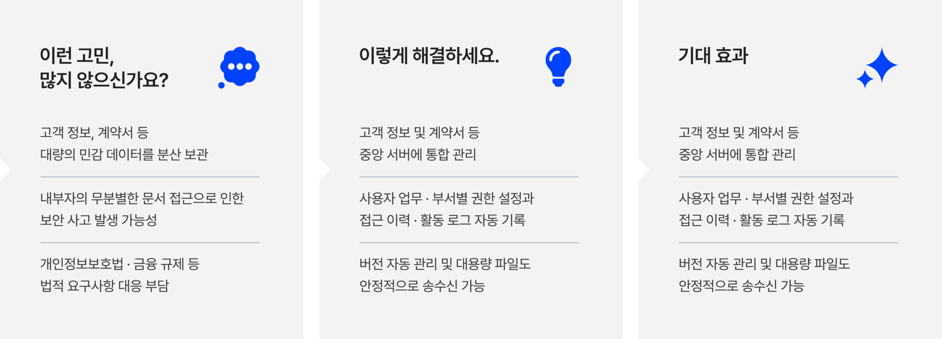 비정형 데이터 증가, 재택근무 확산, 보안 위협 고도화로 기존 파일서버·NAS·클라우드 기반 문서 관리는 통제와 보호에 한계가 있습니다.