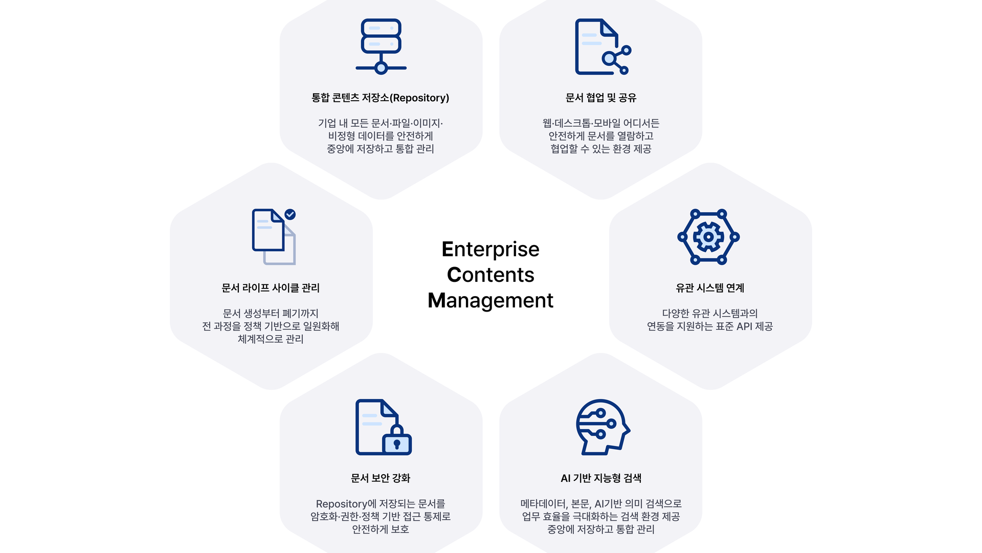 · 그룹웨어(G/W), ERP, 협업 시스템, PMS 등 각종 시스템의 문서를 ECM으로 통합해 자산화하고 활용성을