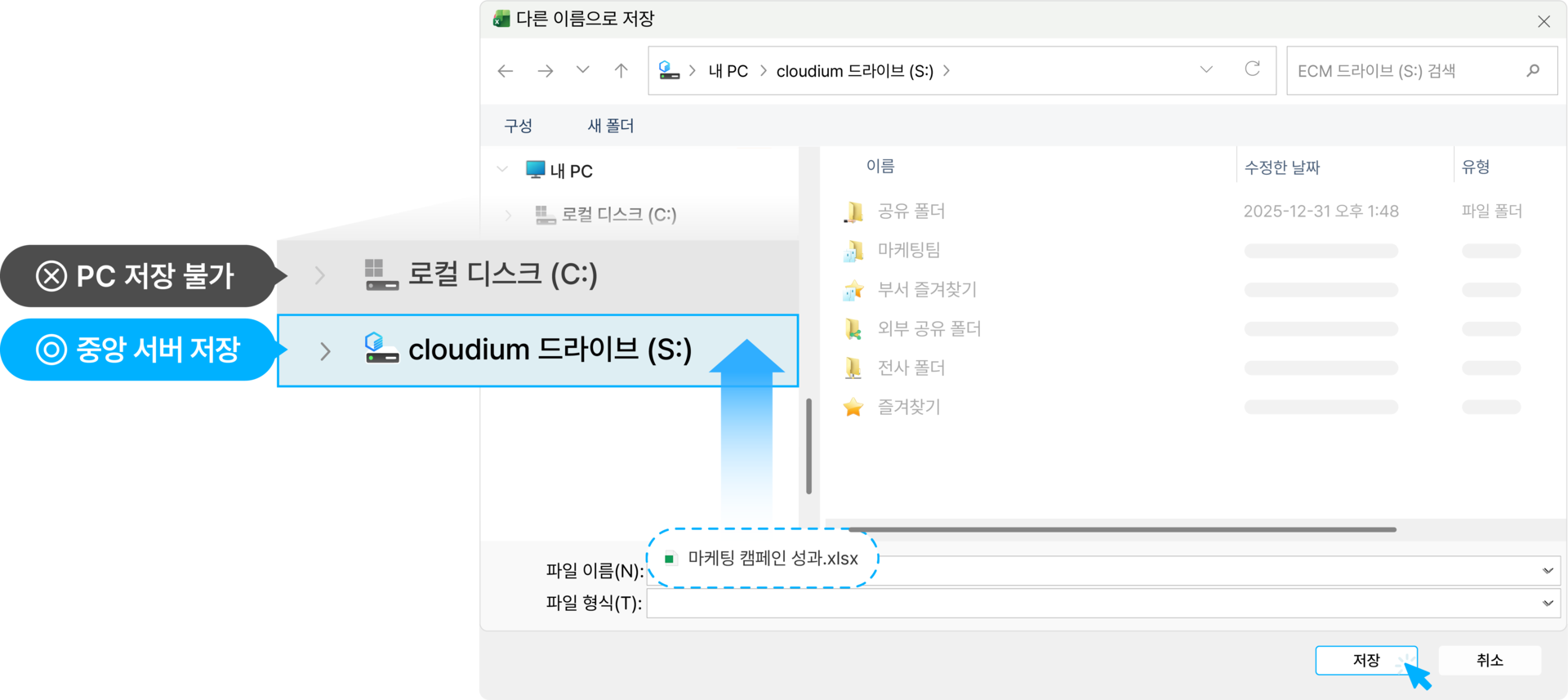 로컬 PC 저장 제어 l 로컬 PC 저장을 원천 차단하고, 모든 문서를 중앙 서버로 안전하게 수집·관리