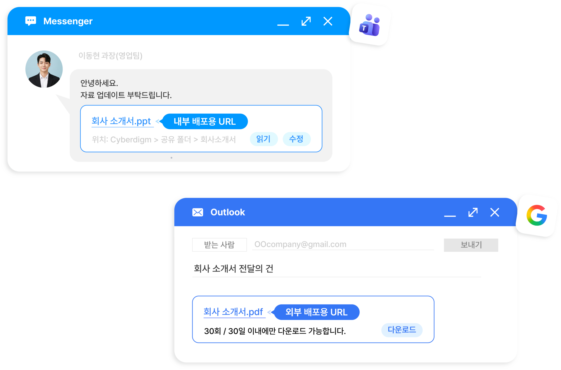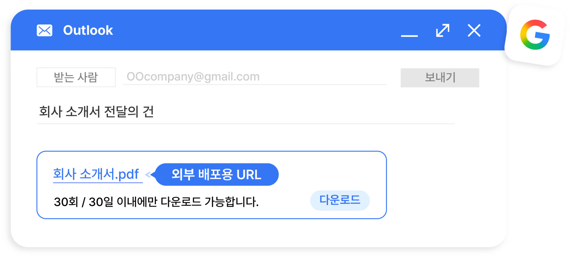 외부 URL 공유 l 외부 협업 대상과 다운로드 기간·횟수를 설정하여 문서 공유